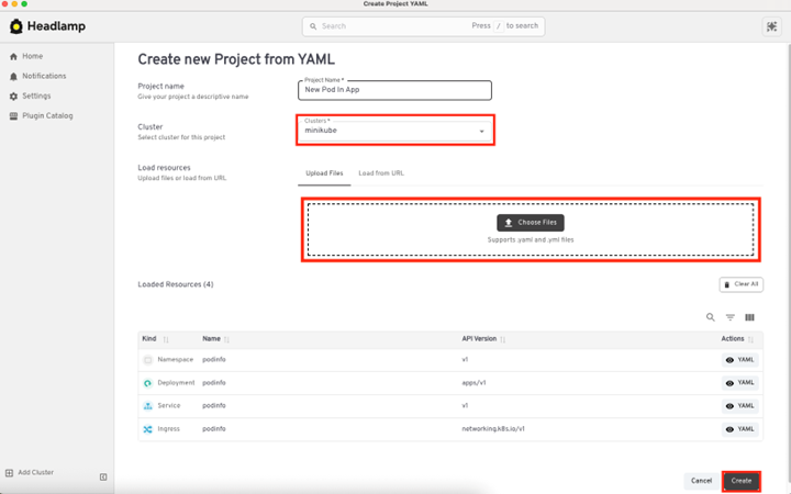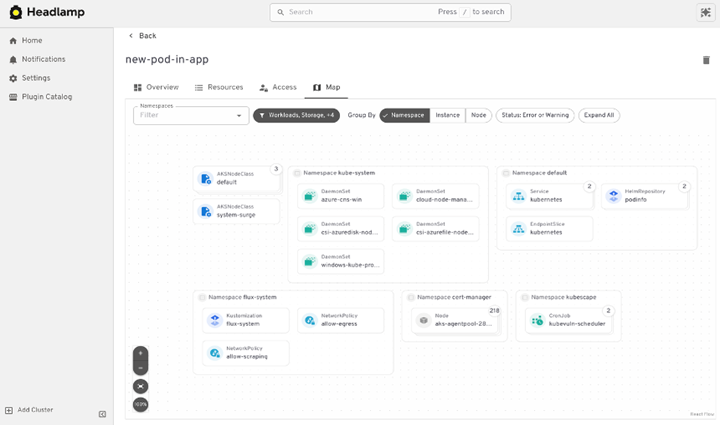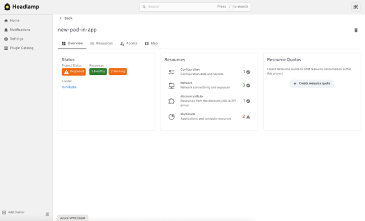 Once created, the cluster appears in Headlamp like any other cluster. You can start and stop it, deploy applications, using Projects, and manage workloads in an application-centric view. Projects group related app resources into a single scoped space, making it easier to troubleshoot, monitor, and collaborate without navigating cluster-wide complexity.